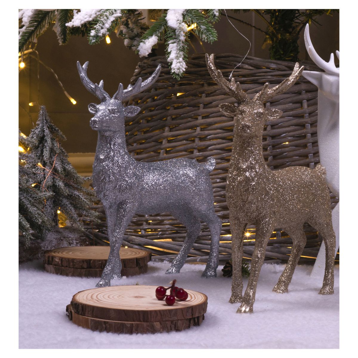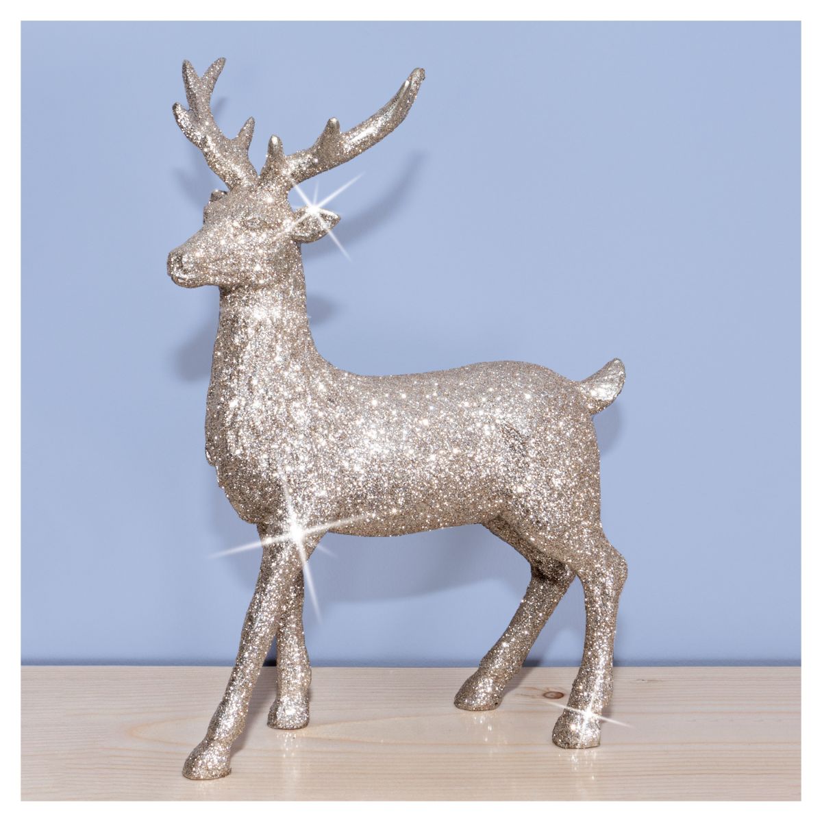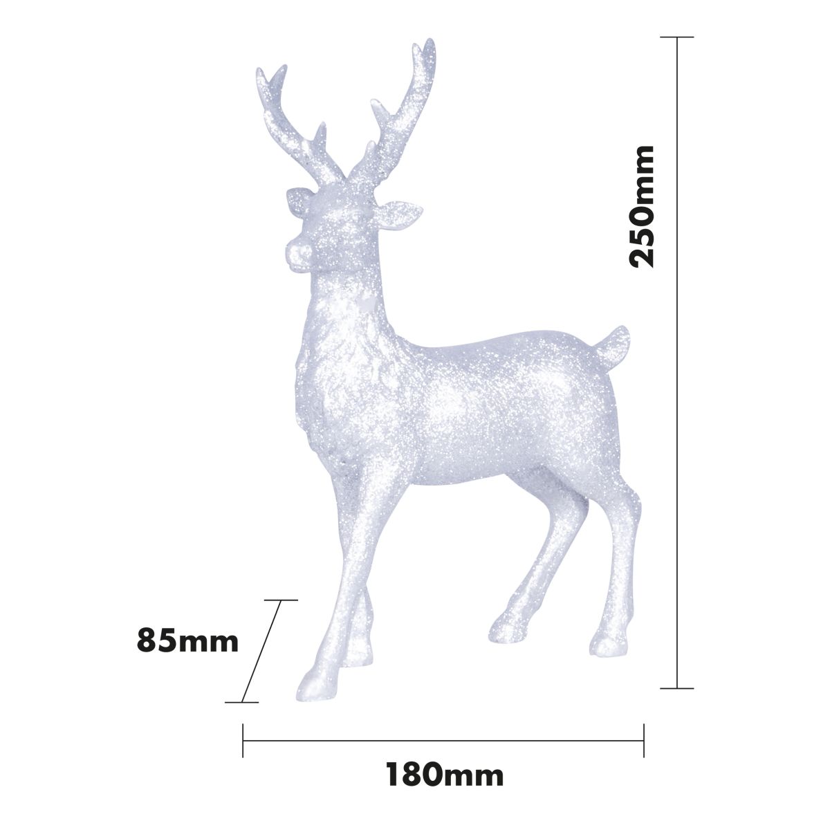Add a touch of class to your Christmas decorations with this beautiful and stylish reindeer figurine. The reindeer stands at a statuesque 25cm and is finished in glitter to give it a wonderful sparkly and shimmering effect particularly in the light of your Christmas tree. This figurine is perfect for displaying in your lounge, hallway, kitchen and would even make a fabulous addition to your work space. This decoration could also be used as part of a temporary display for Christmas parties, model grottos and restaurants and bars. Made from high quality, durable polyresin to ensure many years of use.