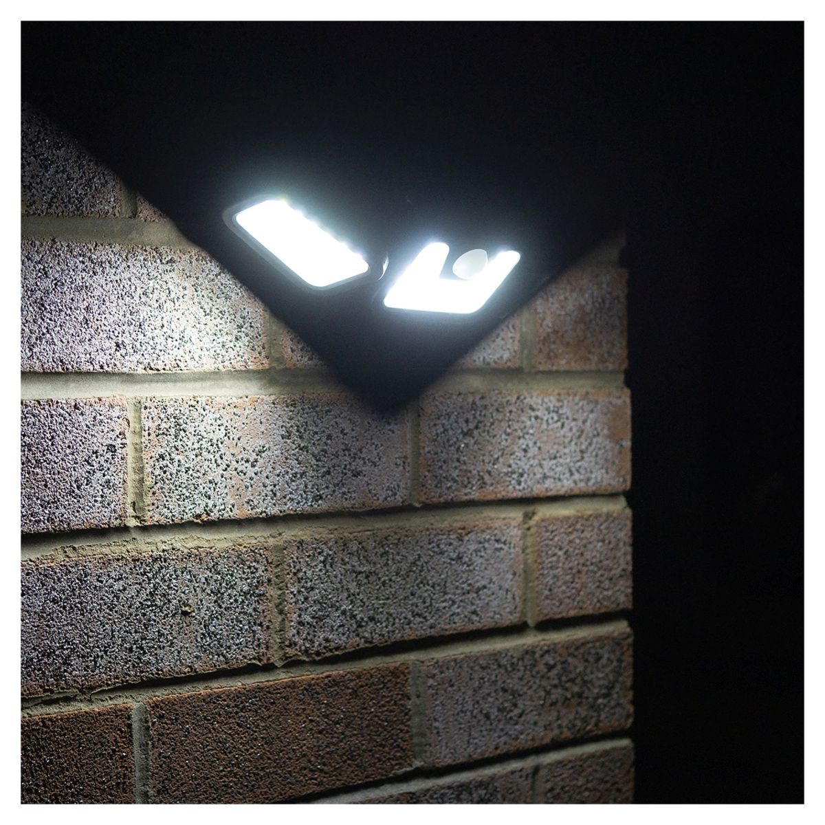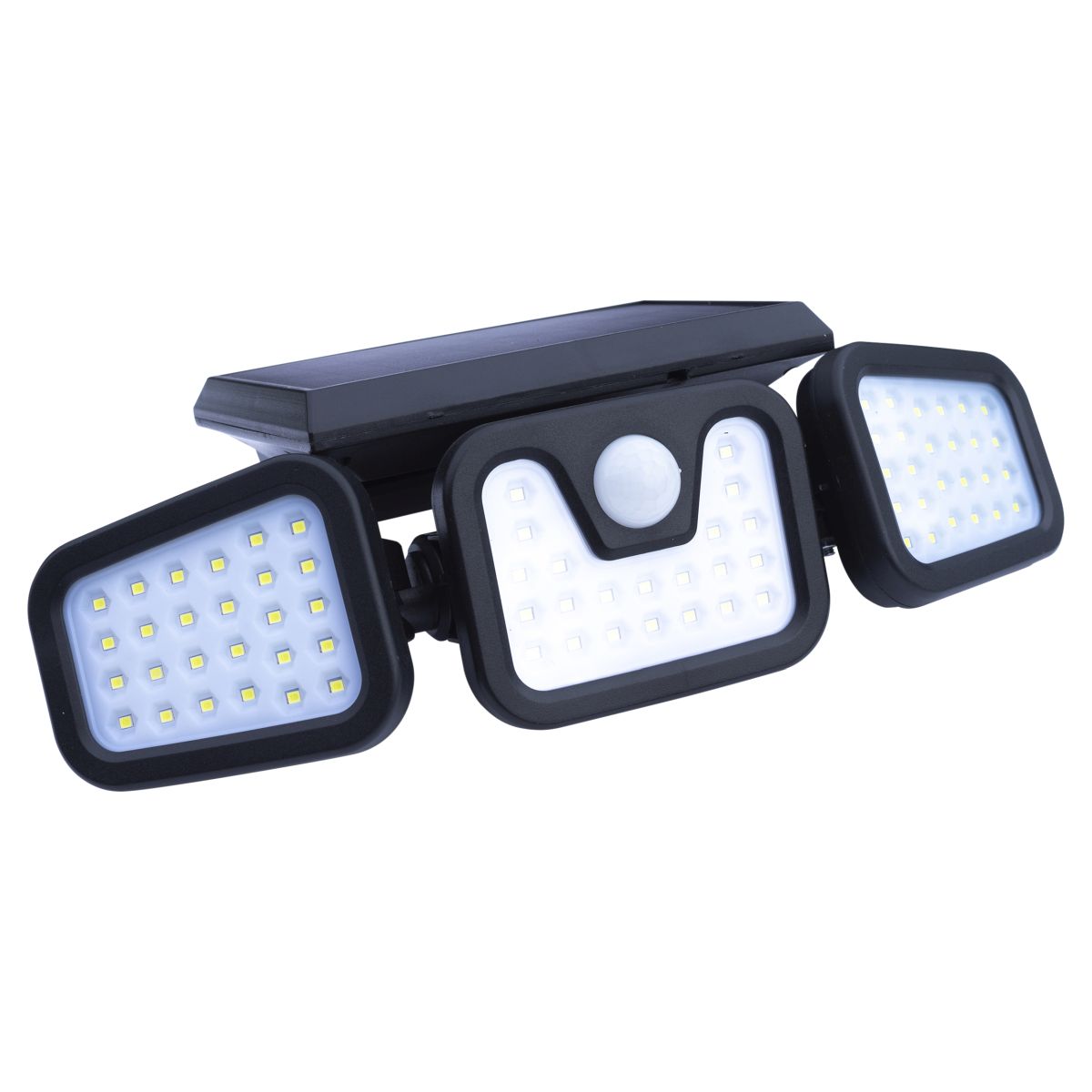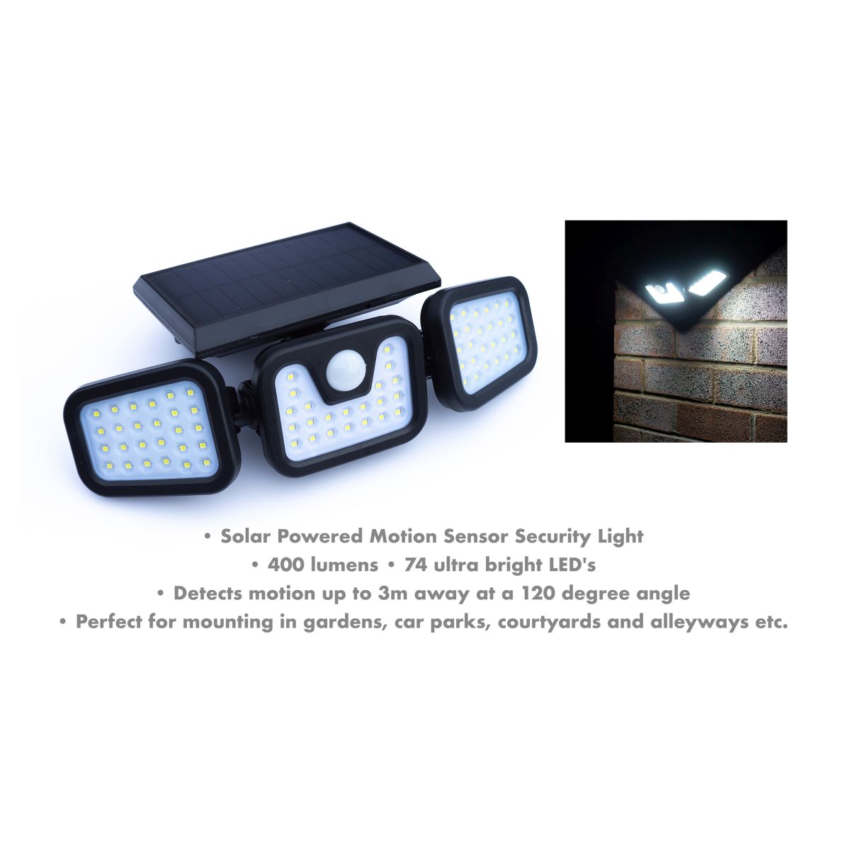 The St Helens Home and Garden solar powered motion sensor security light has 3 heads and gives a 400 lumen illumination. The outer heads have 26 LEDs and the middle head has 22. The outer heads can be angled to focus light wherever it is needed. The light detects motion up to 3m away at a 120 degree angle and will illuminate for 20 seconds. The light can be set to illuminate in low light or full light. The unit is powered by a built in 3,000mA battery. Manufactured from ABS plastic. The light is fitted with a 5.5v 1.5W polysilicon solar panel. The light has 3 pre drilled holes in the solar panel for easy wall mounting.