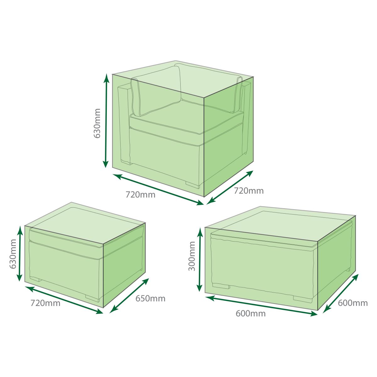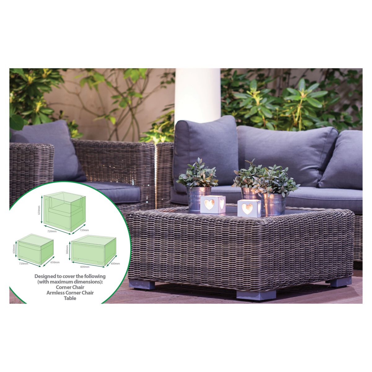 The 3 Piece Large Corner cover set from St Helens Home and Garden is the ideal way to protect your garden furniture from the elements in the winter months. Supplied in a green, water resistant polyethylene the product features eyelets and nylon cord to ensure a snug fit. Includes: Corner Chair Cover - 72x72x63cm Armless Corner Chair Cover - 65x72x63cm Table Cover - 60x60x30cm