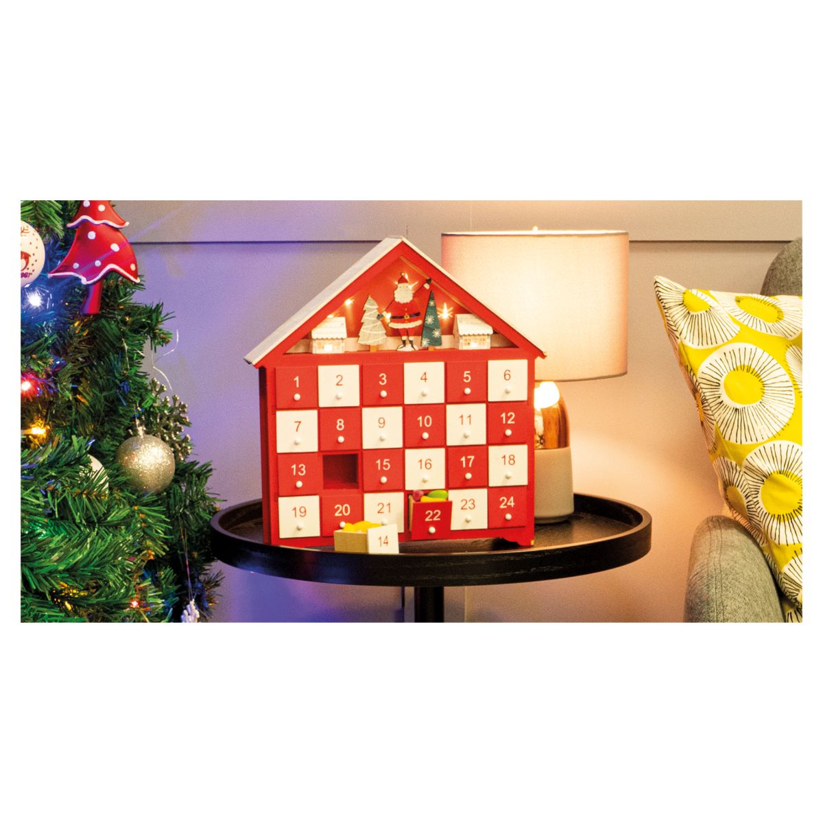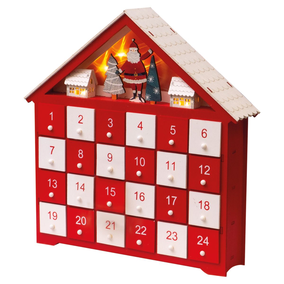 This beautiful advent calendar has a lovely old fashioned feel to it thanks to its wooden construction and the traditional festive red and white colours. The 24 individual drawers are large enough to hide sweets and surprises for your excited children to discover each day in the lead up to Christmas. The advent calendar is designed to look like a house with wooden carvings of Father Christmas, trees and houses under the peak roof. The advent calendar also has lights that shine through the small houses giving it a cosy feel when switched on at night. Requires 2x AA Batteries (not supplied).