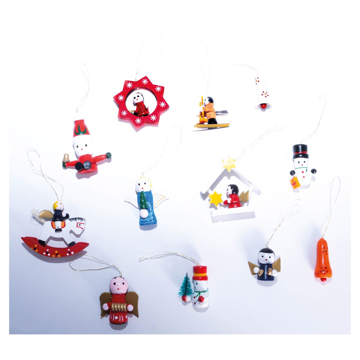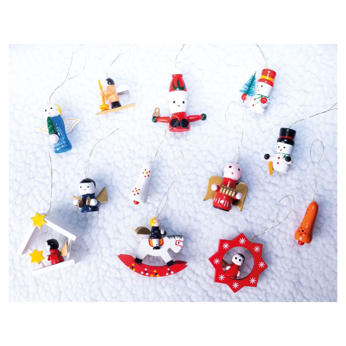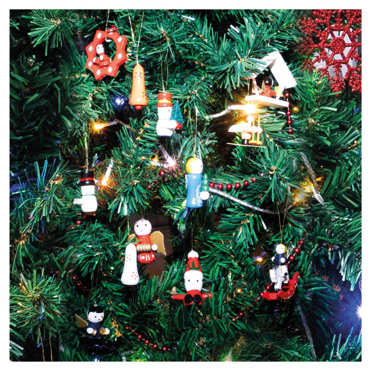 Hang these wooden decorations from your Christmas tree like baubles and create a traditional and rustic theme. Each decoration comes ready to hang with an attached cord. Each of the12 specially selected figurines has a festive theme such as angels, snowmen, drums trains. Made from high quality wood giving them a wonderfully old fashioned feel.