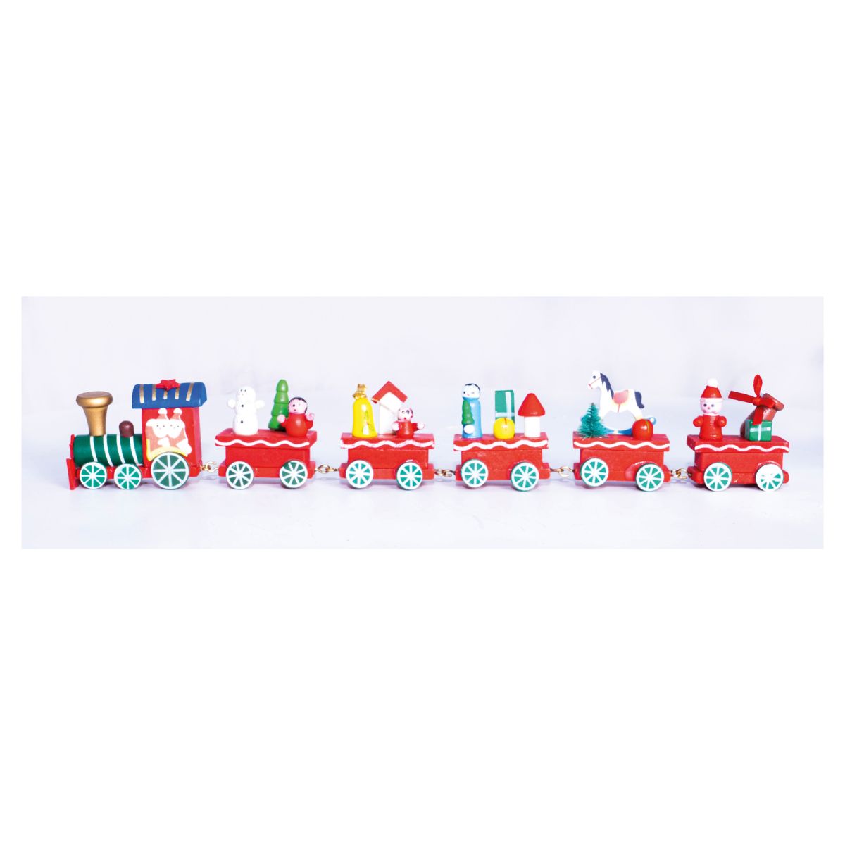 Make Christmas that little bit more special with this beautiful wooden train set, the set consists of an engine and 5 carriages all decorated in vibrant and festive colours. The train is adorned with festive figurines such as snowmen, father Christmas, a rocking horse and presents. Each carriage can be detached and arranged in whatever order you would like. This set would make a thoughtful Christmas gift but would also look great under your Christmas tree or displayed on a coffee table, window sill or fireplace. Made from high quality wood giving it a wonderfully old fashioned feel