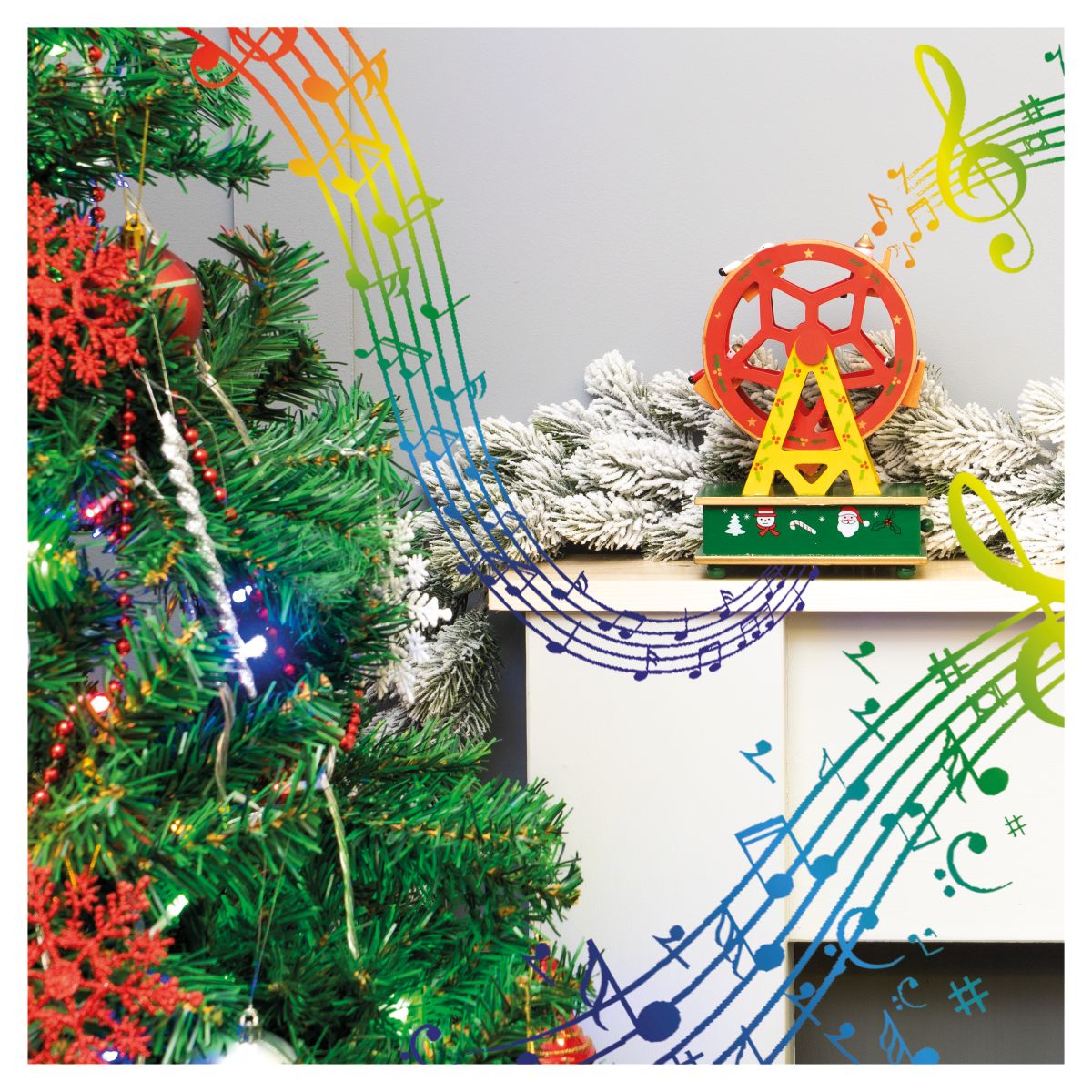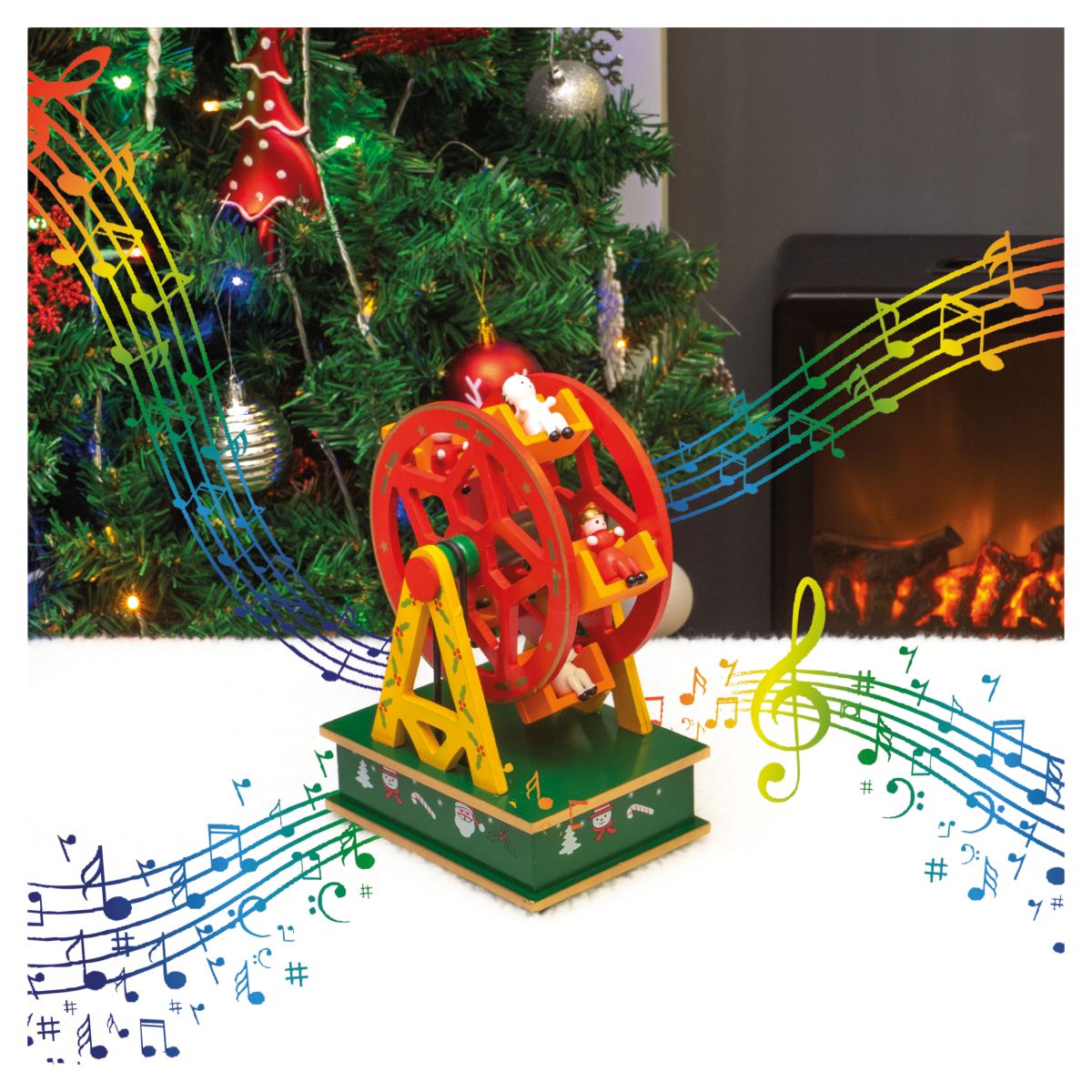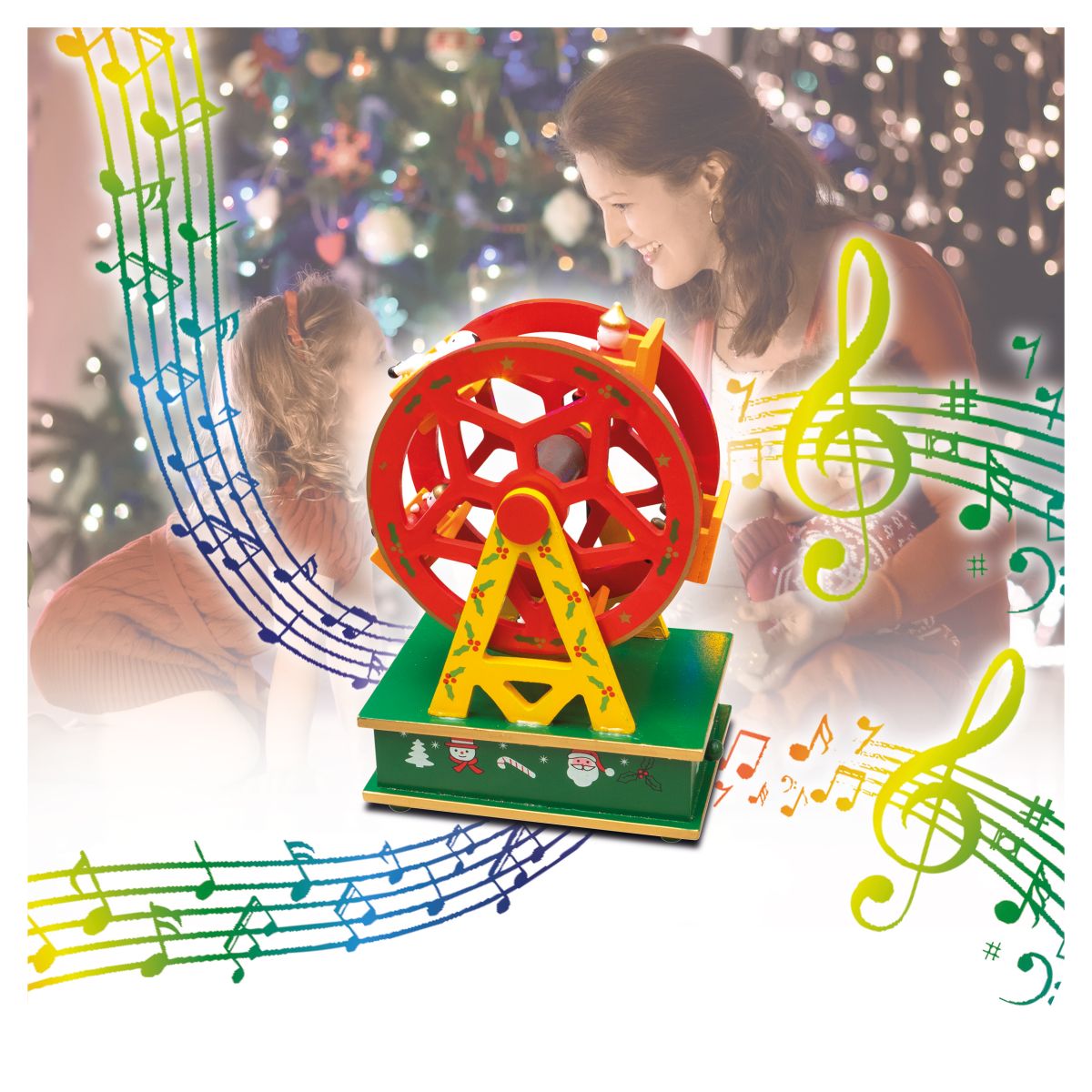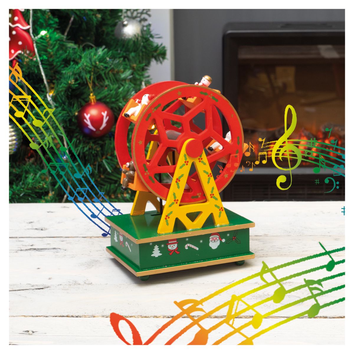 Add a touch of class to your Christmas decorations this year with this beautiful, vibrantly coloured wooden Ferris wheel music box. The red and green colours are very festive and particularly eye catching in the delicate twinkling lights of your Christmas tree. The wheel is mechanical and therefore requires no batteries. Simply turn the winder underneath and enjoy the calming music, you can stop the music at any time by pushing in the lever at the back, pull it back out and the music restarts, while the music is playing the Ferris wheel slowly turns. This set would make a thoughtful Christmas gift but would also look great under your Christmas tree or displayed on a coffee table, window sill or fireplace. Made from high quality wood giving it a wonderfully old fashioned feel. This Ferris wheelies not a toy.