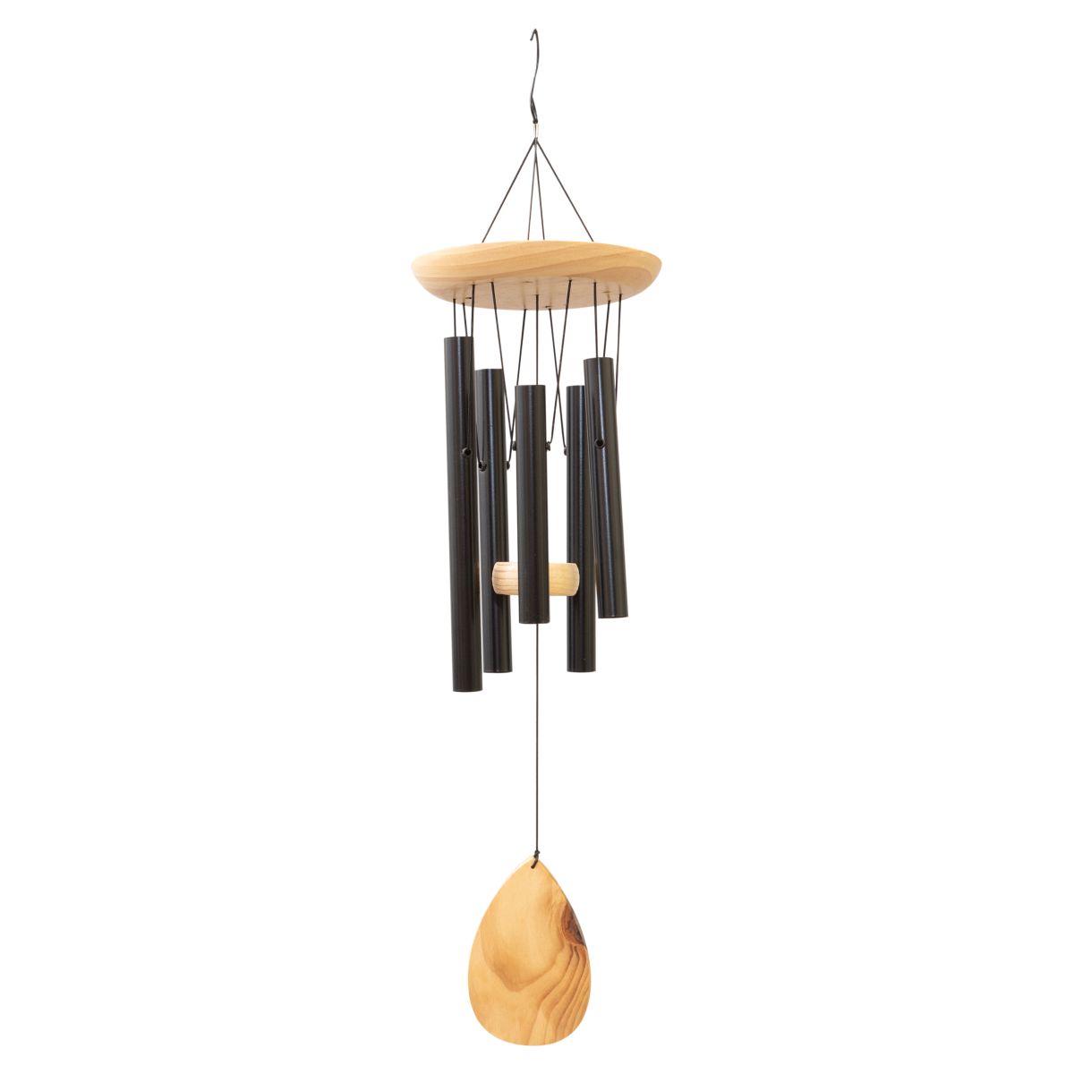 This beautifully crafted wind chime from St Helens and Garden is the perfect decoration for your outdoor space. Wind chimes date back thousands of years and are known to be symbols of good fortune and help to ward off bad spirits. from the wooden disc hang 5 tubes, each is hand tuned to create a deep and soothing tone, the tubes are of varying lengths meaning they each give off a different note. The calming music is created when the wind catches the wind catcher at the bottom of the chime causing the aluminium tubes to collide. The top disc, bell and wind catcher are made of natural wood and the tubes are black aluminium. The wind chime is fitted with a hook which can be used to suspend it from trees, lights or brackets. The total hanging length of the wind chime from the top of the hook to the base of the wind catcher is 55cm