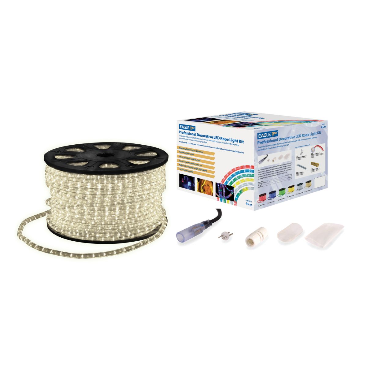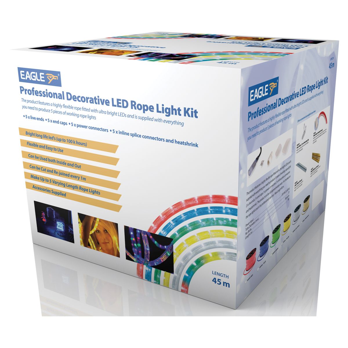 A highly flexible and robust decorative rope lighting product supplied with a set of comprehensive wiring accessories allowing up to 5 separate rope lights to be assembled. The product features ultra bright LEDs producing intense vibrant colours, highly flexible tube allowing complex designs and shapes to be formed, simple and quick to make up and install with a large operational temperature range of between -20C to + 60C. The product is supplied with 5 x 2m live ends, 5 x end caps, 5 x power connectors, 5 x inline splice connectors, heat shrink and glue. The product can be cut approximately every 1m (marked on the rope light) and is for professional use only.