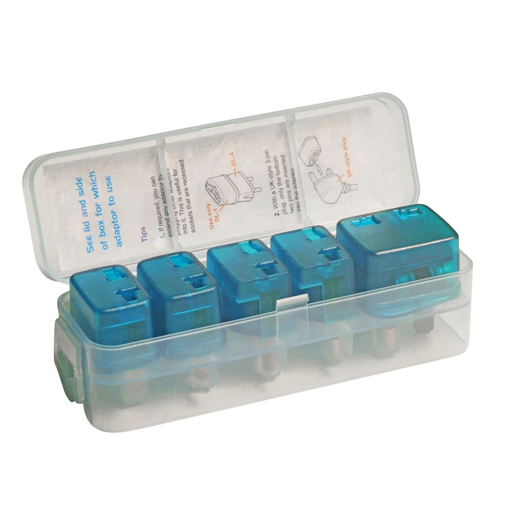 Universal travel adaptor set that can be used in over 150 countries on 6 continents. The product consists of 5 interlocking parts for ideal storage while travelling, and separates for ease of use. All adaptors are fully shuttered in accordance with local standards and directives.