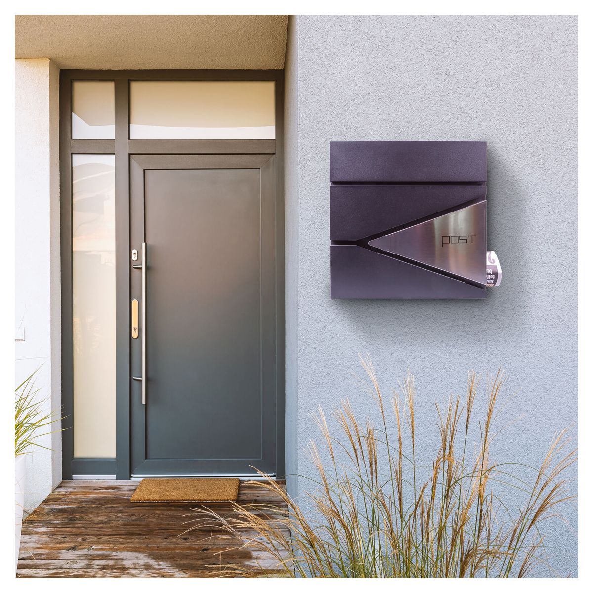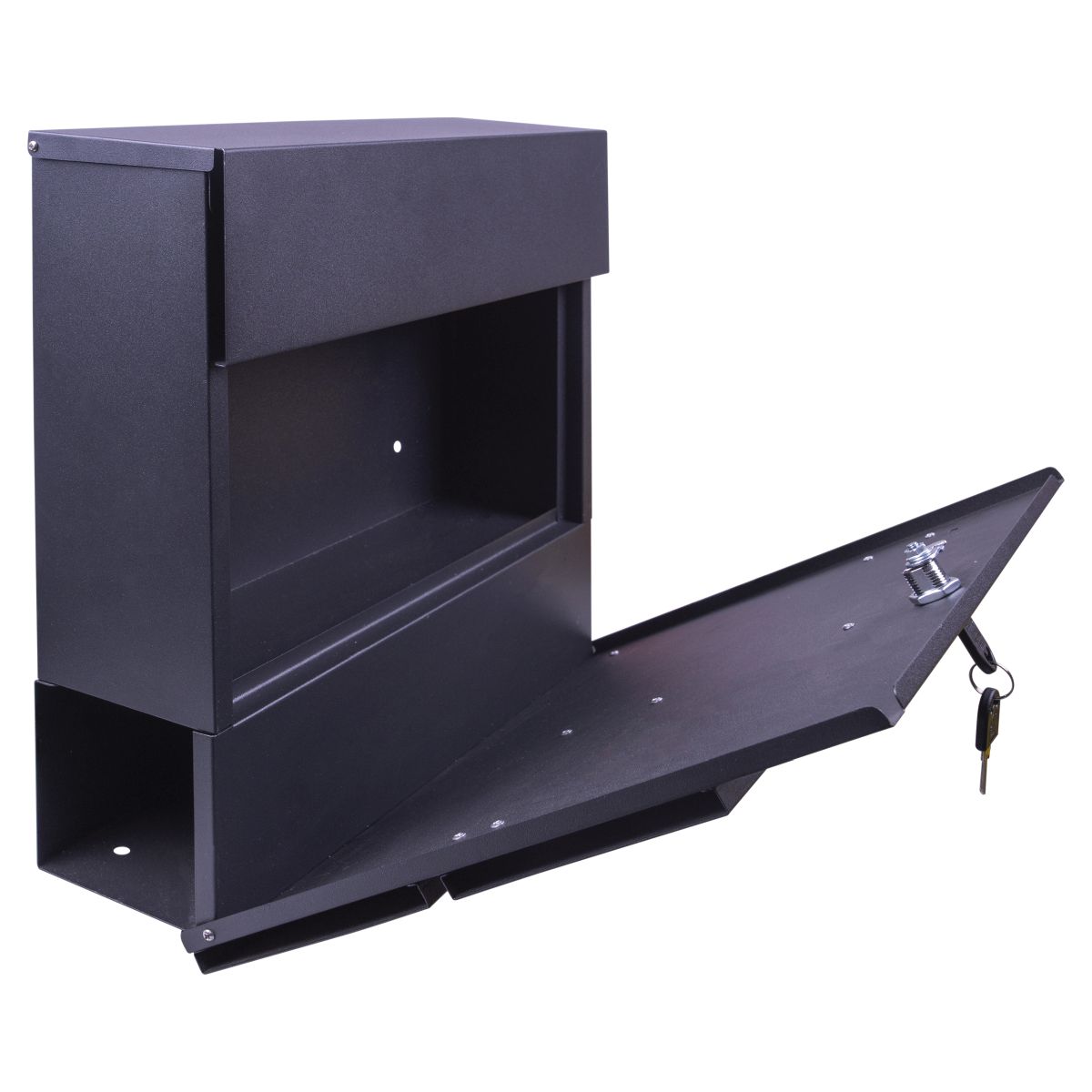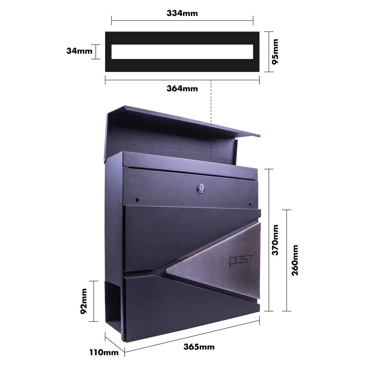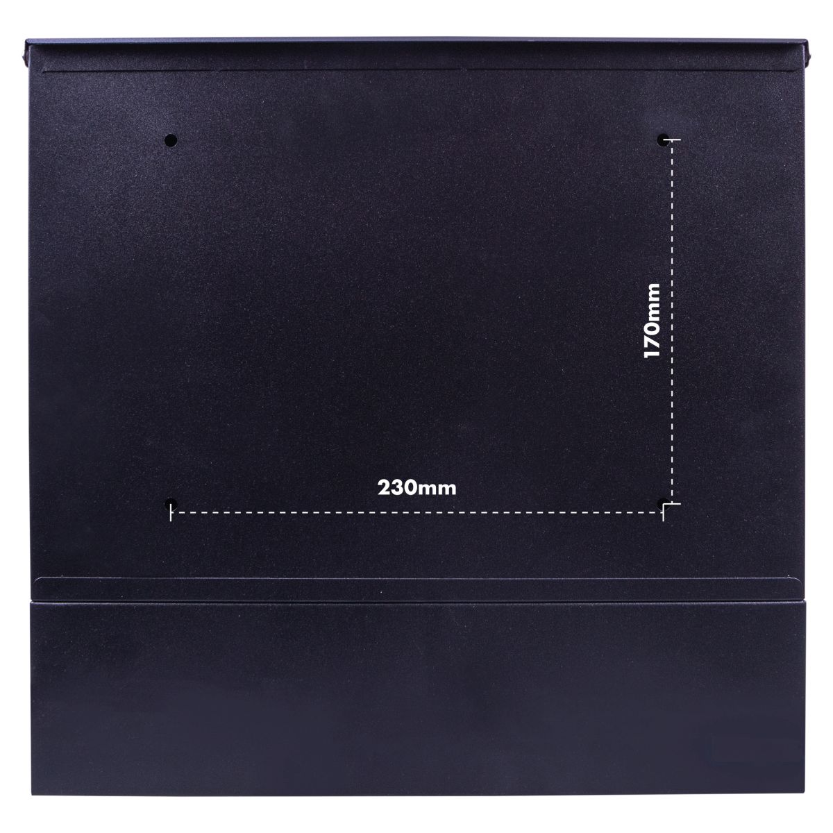 Wall Mount Lockable Letterbox. A large capacity, modern style letterbox, will accommodate large and small letters. Newspapers, catalogues and magazines can be placed in the slot at the base. The modern design makes this wonderful letterbox aesthetically pleasing as well as functional. Mail is dropped through the opening at the top of the box and can be retrieved at your own convenience using the supplied keys, there is a flap at the top opening to help keep your mail dry. This letterbox is designed to be wall mounted and has 4 pre drilled holes in the back, screws and rawl plugs are supplied for quick and easy installation. Made from high quality powder coated galvainsed steel to ensure it will withstand the elements for many years to come. Supplied with 2 keys.