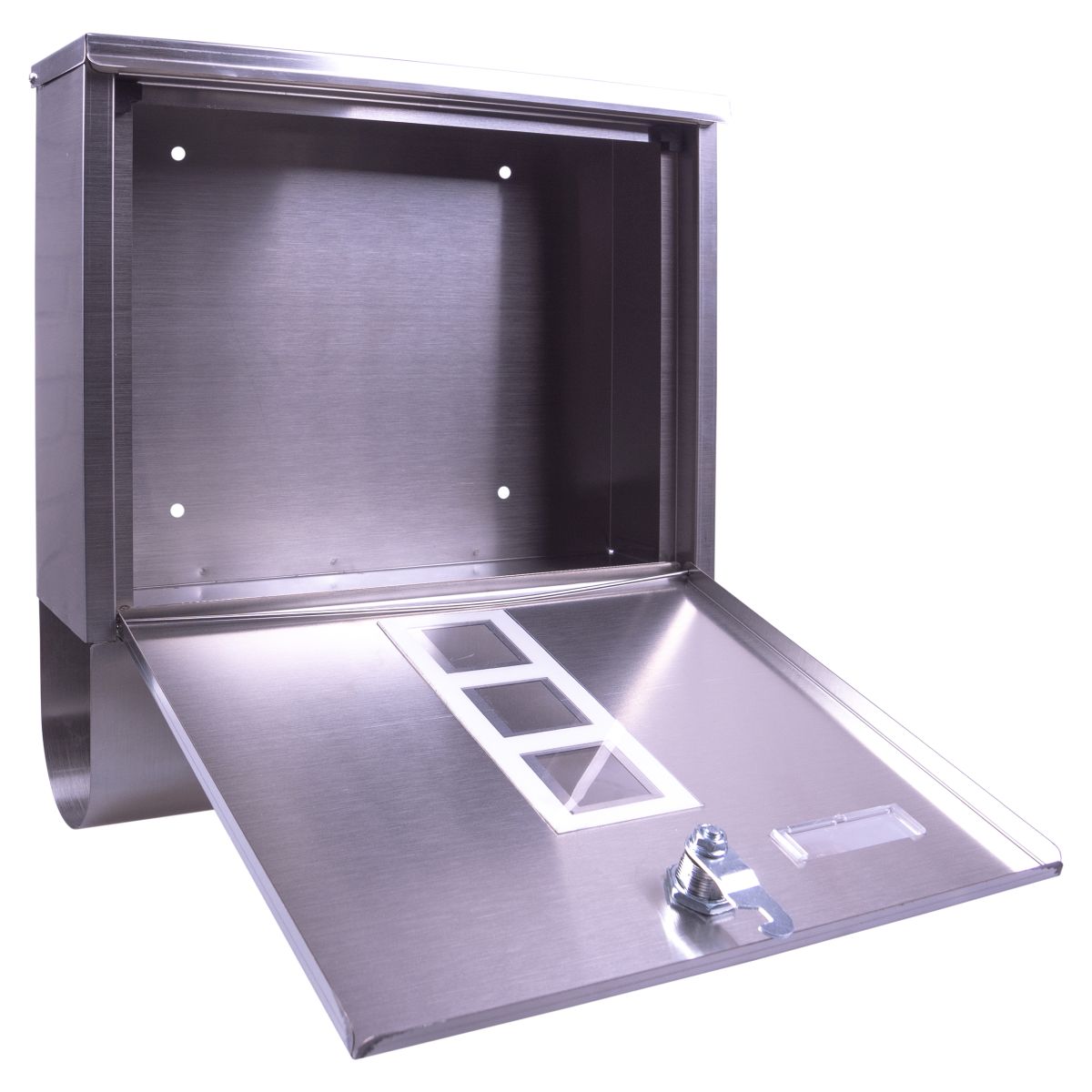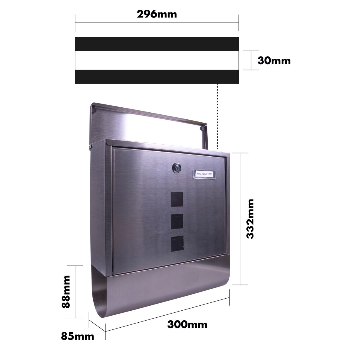 Wall Mount Lockable Letterbox. A large capacity, modern style letterbox, will accommodate large and small letters. Newspapers, catalogues and magazines can be placed in the slot at the base. The modern design makes this wonderful letterbox aesthetically pleasing as well as functional. Mail is dropped through the opening at the top of the box and can be retrieved at your own convenience using the supplied keys, there is a flap at the top opening to help keep your mail dry. There is a handy slot where you can place a card detailing your house number or name.This letterbox is designed to be wall mounted and has 4 pre drilled holes in the back, screws and rawl plugs are supplied for quick and easy installation. Made from high quality stainless steel to ensure it will withstand the elements for many years to come. Supplied with 2 keys.
