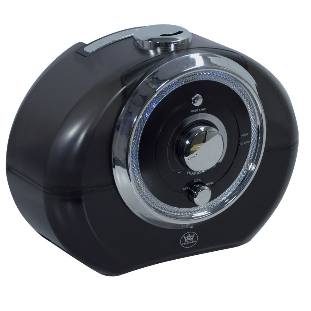 Prem-I-Air warm/cold mist humidifier, 4.5L semi transparent black tank, in keeping with the glossy black finish of the body, and a built-in night light function. The humidifier features include a power on neon light, water shortage indicator, spray volume adjustment and silver clean technology to fight the growth of bacteria and mould in the tank. It provides up to 18 hours of successive warm humidification, or over 55 hours of cool humidification on low setting.