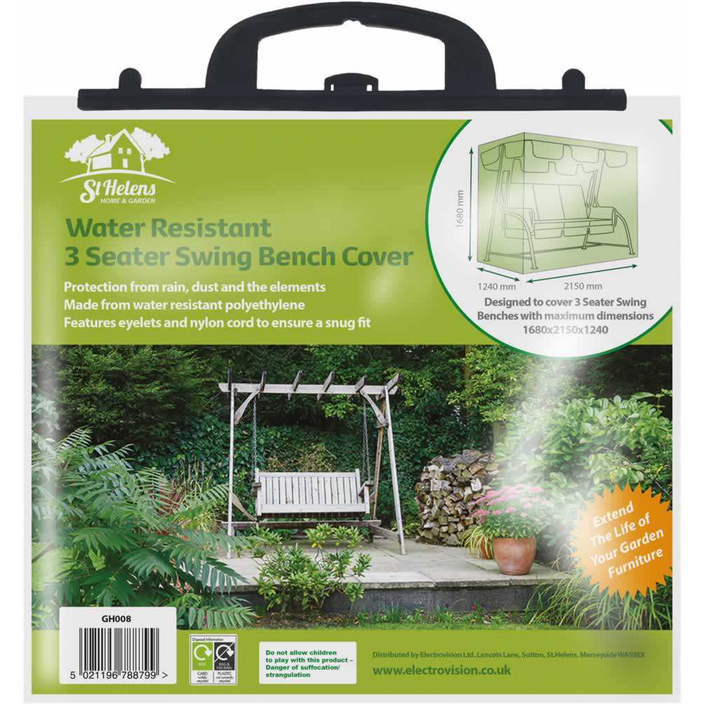 The 3 seater swing bench cover from St Helens Home and Garden is the ideal way to protect your swing bench from the elements in the winter months, extend the life of your swing bench and keep it looking as good as new for as long as possible. Supplied in green to ensure it blends in with your garden the cover is made from water resistant polyethylene, the product features eyelets and a nylon cord to ensure a snug fit.