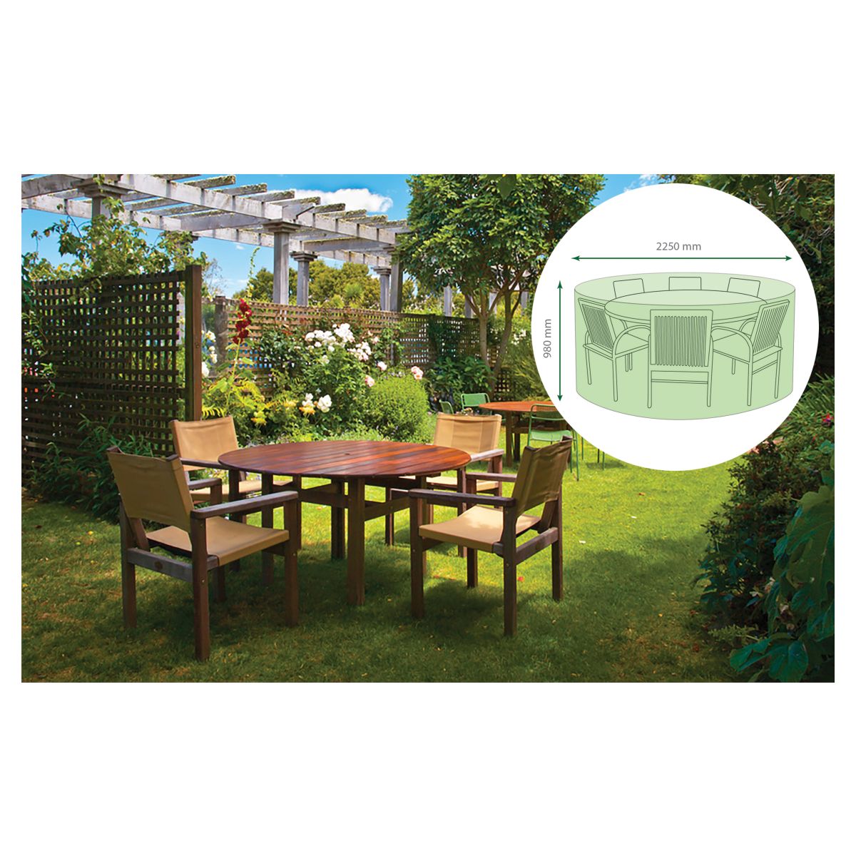 Designed to cover large, round patio sets with maximum dimensions height 980mm diameter 2250mm