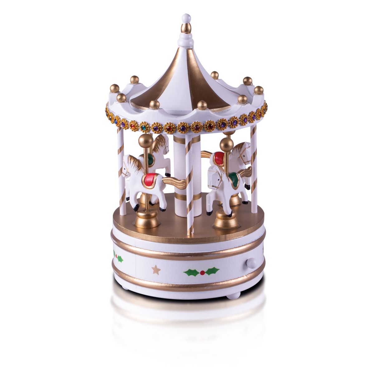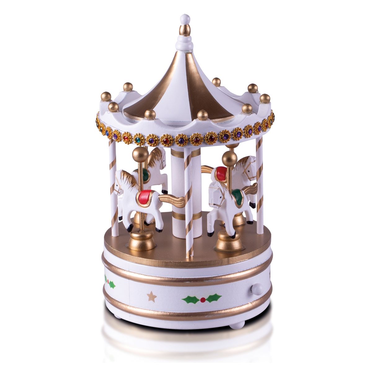 Add a touch of class to your Christmas decorations this year with the beautiful, vibrantly coloured wooden carousel music box. The vibrant colours are very festive and particularly eye catching in the delicate twinkling lights of your Christmas tree. The carousel is mechanical and therefore requires no batteries. Simply turn the winder underneath and enjoy the calming music, you can stop the music at any time by pushing in the lever at the back, pull it back out and the music restarts, while the music is playing the carousel slowly turns. This decoration would make a thoughtful Christmas gift but would also look great under your Christmas tree or displayed on a coffee table, window sill or fireplace. Made from high quality wood giving it a wonderfully old fashioned feel. This carousel is not a toy.