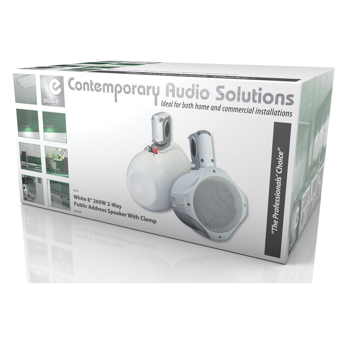 High quality 8 Inch 2-way public address speaker. This 260 W speaker is part of the e-audio range and has a heavy duty ABS construction, quick connect speaker terminals, along with an 8 inch long excursion woofer and directable 1 inch titanium dome tweeter. Priced and sold in pairs.
