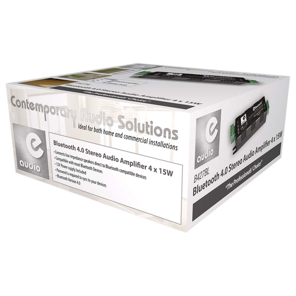 This compact Bluetooth audio amplifier allows the connection of Bluetooth devices to low impedance speakers via the built-in power amplifier. The unit can power up to 4 x 15W speakers at 4 or 8 Ohms and is supplied with four 3m speaker cables and 1 x 4 way phoenix connector. The compact design makes the unit ideal for fitting into small spaces like ceiling voids and is powered by a 12V PSU (Supplied). The unit is ideally suited to ceiling speakers but can work equally well with wall or floor mounting units. Connection to different devices is simple and secure using the user name and password in the manual.