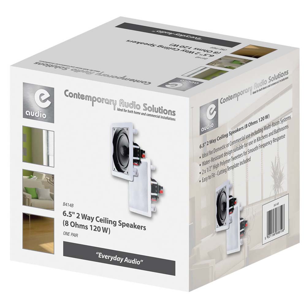 We're really sorry... ...we don't currently have that one in stock Please add your email and we'll notify you when it's back Email Your Name Your Email Your Comments SendClose Window Login Details Email Password Remember login on this computer? New Account Full Name Email Password All Categories» Advertising EquipmentAerials and Signal EquipmentAudio VisualAutomotive and MobileCabinet Speakers and AccCablesConnectorsDoor Entry and IntercomsElectricalEntertainment LightingGift IdeasHeating and CoolingHobbiesHome and GardenLampsLeadsLightingPower SuppliesPublic AddressSecurity ProductsSound SectionStands and SupportsStorageTelecommunicationTest EquipmentTools and Service Aids » 100V Line TransformersAttenuatorsMedia PlayersMegaphonesPA AmplifiersPA MicrophonesPA SpeakersRadio CommunicationSound LimitersSpeaker Horns » 100 Volt Ceiling100 Volt WallADS SpeakerCeiling SpeakersIn Wall SpeakerLow Impedance WallMarine SpeakerOutdoor SpeakerPendant SpeakerSpeaker Accessories » All Products eAudio White 6.5 inch 2 Way Ceiling Speakers 8Ohm 120WPRODUCT ID B414BThis pair of 6.5 inch 2-Way Ceiling Speakers 8Ohm 120W are ideal for use in most commercial and domestic installations including surround sound and multi-room systems. The Ceiling Speak...STOCK LEVEL 99 In StockPrice: £28.79 Quantity-+ Add to Cart« Previous | Next »Description This pair of 6.5" 2 Way Ceiling speakers is ideal for use in most commercial and domestic installations including surround sound and multi-room systems. The Ceiling Speakers are water-resistant, which makes them suitable for use in kitchens or bathrooms. The 1/2" High Polymer Tweeters offer smooth frequency response in hi-fi applications. Part of the e-audio Everyday Audio range, the Ceiling Speakers are easy to fit and are supplied with a cutting template for convenience. Priced and sold in pairs. Colour White Dimensions (mm) 220x220 Packing Retail Box Cut-Out Dimensions (mm) 185x185 Impedance (Ohms) 8 Sensitivity (dB) 89 Peak Music Power (W) 120 Power RMS (W) 60 Frequency Response (Hz) 60-20000 Type 2 Way Mounting Depth (mm) 76